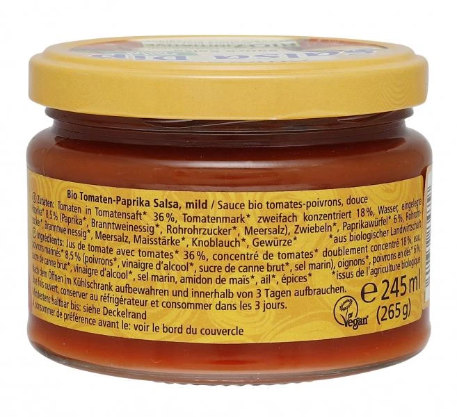 Ein milder Bio-Salsa-Dip mit fruchtigem Tomaten-Geschmack und würzig-mexikanischer Note. Zum Verfeinern von Wraps und Gemüsegerichten oder ganz klassisch zum Dippen von Maischips. Vegan.