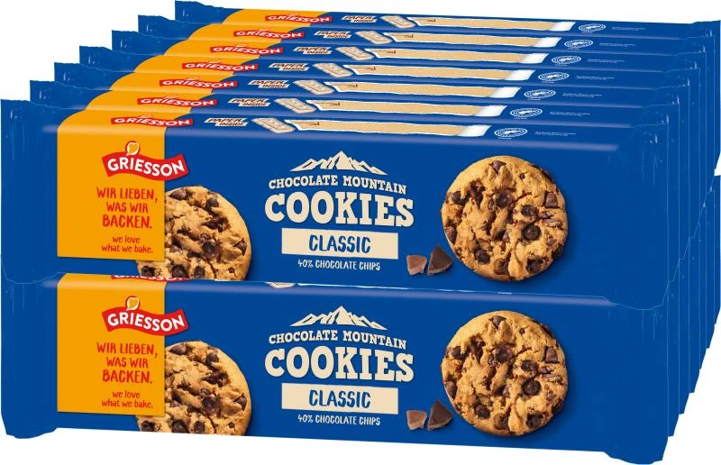 Mürbegebäck mit Vollmilch- und Zartbitterschokoladenstückchen. Nach raffiniertem amerikanischem Rezept gebacken, verwöhnen die knusprigen Chocolate Mountain Cookies Classic mit leckeren Schokostückchen jeden Genießer. Jede Menge leckerer Schokostückchen und knuspriger Teig: Der Chocolate Mountain Cookie ist eine Köstlichkeit für die ganz großen Genießer. Nach typisch amerikanischer Art mit viel Liebe goldbraun gebacken, werden für die Chocolate Mountain Cookies Classic nur die besten Zutaten aus Getreide und zarter Schokolade verwendet. Der hohe Schokoladenanteil bei Classic 40% sorgt für ein besonders schokoladiges Geschmacks-Erlebnis.