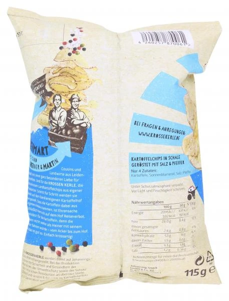 Dicke Kartoffelscheiben werden mit Schale in hochwertigem Sonnenblumenöl besonders kross gebacken. Nur 4 Zutaten: Kartoffeln, Sonnenblumenöl, Salz und Pfeffer – und schon sind unsere Krossen Kerle Salz & Pfeffer fertig. Der bunte Pfeffer sieht nicht nur gut aus, sondern gibt auch eine besondere Geschmacksnote!