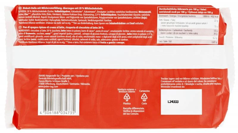 Biskuit-Rolle mit Milchcremefüllung, überzogen mit 29% Milchschokolade.