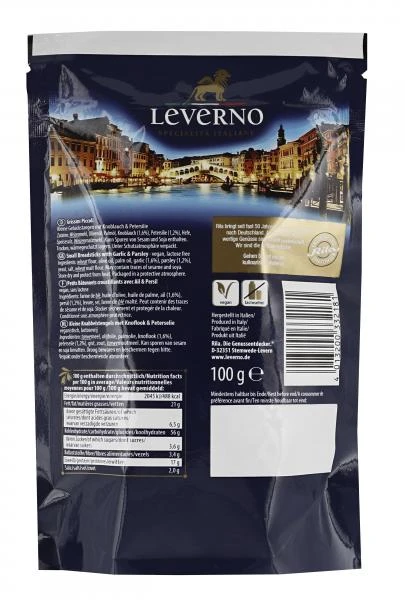 Kleine italienische Gebäckstangen in wiederverschliessbarer Verpackung. Dieser würzige Snack mit Knoblauch und Petersilie ist ideal für zwischendurch und unterwegs.