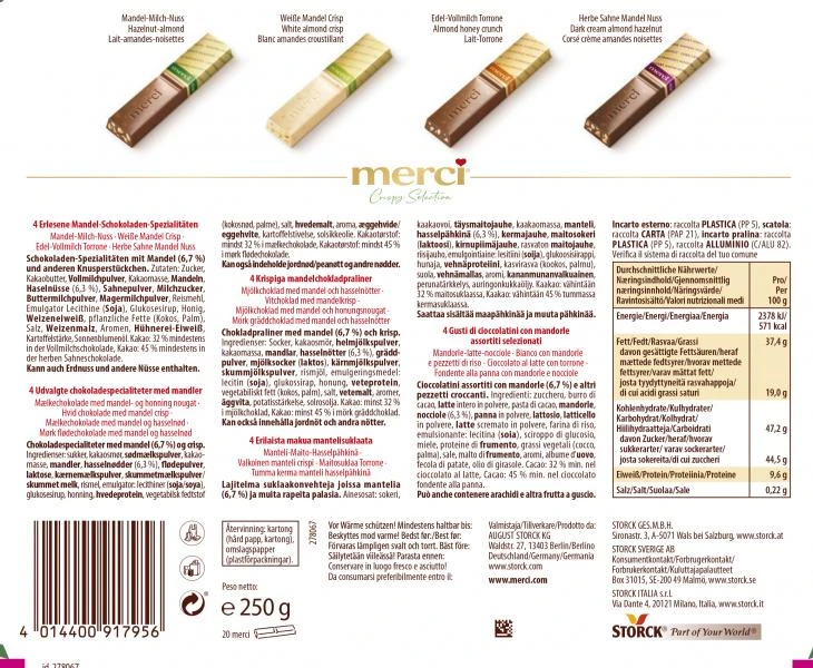 Vollmilchschokolade mit Nuss- und Mandelstückchen: 32% mindestens, Herbe Sahneschokolade mit Mandelstückchen: 45% mindestens, Weiße Schokolade mit Mandelstückchen und Reis-Crisps: 28% mindestens, Vollmilchschokolade mit weißem Mandel- und Honig-Nougat: 32 % mindestens im Schokoladenanteil