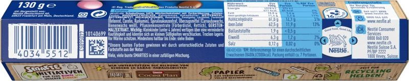 SMARTIES® Schokolinsen sind nicht nur schokoladig-lecker und fröhlich-bunt, sondern bieten zusätzlich großen Spielspaß. Unverkennbar in der klassischen Riesenrolle, eignen sich SMARTIES® perfekt als kleines Geschenk oder zum Teilen. Mit bunten Farben aus der Natur, ohne Aromen und Zusatzstoffe und in recyclebarer Verpackung.