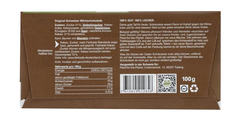 100% gut. 100% lecker. Deine gute Tat für heute: Schokolade essen! Denn im Kampf gegen die Klimakrise und für eine bessere Welt tut hier jedes einzelne Stück etwas Gutes. Beispiel gefällig? Bäume pflanzen! Händler und Hersteller verzichten auf ihren Gewinn und spenden ihn an die Kinder- und Jugendinitiative Plant-for-the-Planet. Davon werden neue Bäume gepflanzt. Die nehmen das Treibhausgas CO² aus der Luft auf, speichern den Kohlenstoff im Holz und geben Sauerstoff ab. Fünf verkaufte Tafeln = ein neuer Baum, garantiert. Und mit dem Code auf der Packung kannst du deinen gepflanzten Baum sogar in dem virtuellen Wald verewigen.