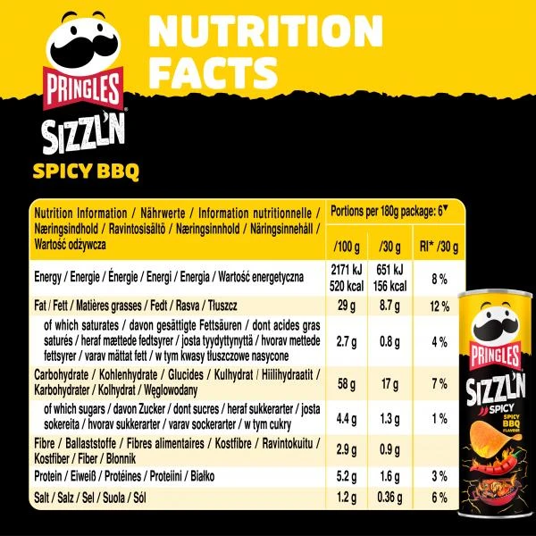 Pop. Play. Eat! Pringles Sizzl’n Das Poppen des Deckels, der unwiderstehliche Duft, der knackige Crunch ? Pringles sind eine Snack-Erfahrung für alle Sinne. Finde dein eigenes Pringles Ritual: ein, zwei, drei Chips auf einmal? Die Form des hyperbolischen Paraboloids macht’s möglich. Mische deine Lieblingssorten und entdecke die ganze Vielfalt von Pringles! Die praktische Dose sorgt für einen frischen Crunch mit jedem Pop. Dein Pringles Moment: Dein Pringles Ritual: Die rauchig-scharfen BBQ Chips feiern eine Grillparty in deinem Mund und die einzigartige Form lädt zum Entdecken und Spielen ein ? es gibt unzählige Arten, Pringles zu snacken! Pop it: Jeder erkennt das Pop-Geräusch, wenn endlich eine Dose Pringles aufgemacht wird. Teile sie als Party Snack mit Freunden und habt Spaß! Die Dose hält die Chips lange knusprig frisch. Clevere Form: Das hyperbolische Paraboloid (ja, so heißt das) sorgt für maximalen Spaß und passt perfekt in deinen Mund. Hast du schon mal den Entenmund gemacht? Einfach stapeln: Stapel dir deinen Pringles Moment mit leckeren Sorten wie Sweet Paprika, Pringles Original oder Texas BBQ Sauce und entdecke immer wieder neue Kombinationen. Das bekommst du: Pringles Sizzl’n Spicy BBQ Flavour scharfe Chips in der wiederverschließbaren Dose, inkl. einer Extra-Portion Spaß und Stimulation für deine Geschmacksknospen.
