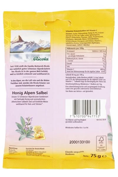Echter Honig und würziger Alpen Salbei sowie die Ricola Kräutermischung aus 13 Schweizer Bergkräuter ergeben den feinen Geschmack dieses Ricola Honig-Kräuter Bonbons. Ein fein-milder Genuss für die ganze Familie. Natürlich wohltuend für Hals und Stimme.