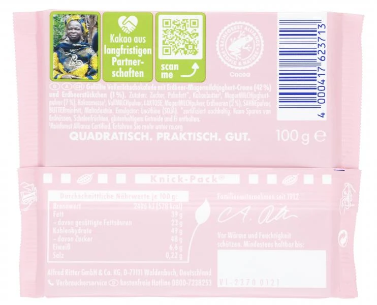 Mit der Ritter Sport Erdbeer Joghurt hat der Sommer das ganze Jahr Saison. Viele Fruchtstückchen, Erdbeer-Joghur-Creme und knusprige Reiscrisps sorgen in jedem Stück für heitere Aussichten. Ritter Sports Vorhersage: Mit diesem quadratischen Erdbeerfeld sind Sie überall heiß begehrt.