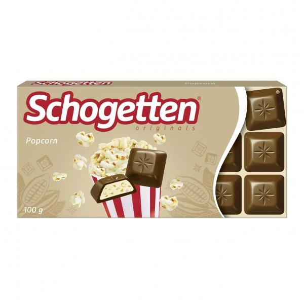 Edel-Alpenvollmilchschokolade mit 46% Milchcremefüllung mit geröstetem Mais und Popcornstücken.